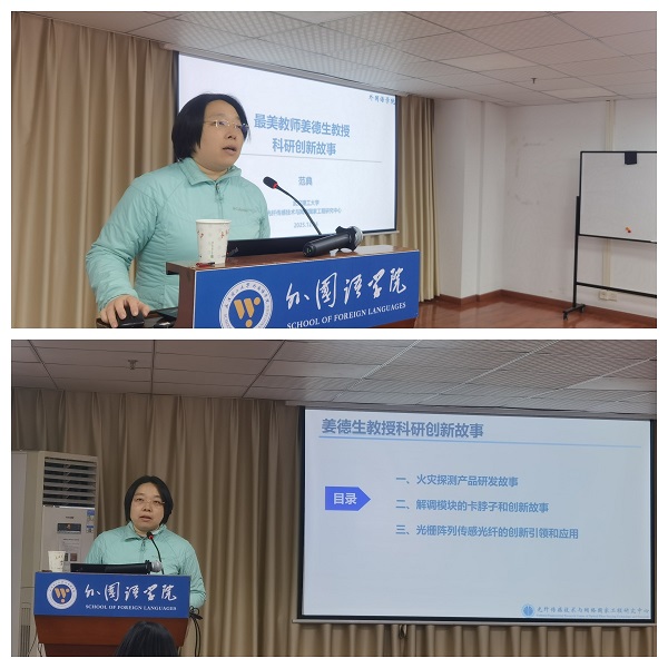 2025年12月4日下午,外国语学院在学海楼11楼学术报告厅举办“师德讲坛”暨全国“最美教师”姜德生院士事迹宣讲报告会。报告会特邀校宣讲团成员、光纤传感技术研究中心副主任范典研究员进行宣讲。学院党委委员、班子成员、各师生党支部书记及支部委员、教职工代表与学生代表共同参会。报告会由学院党委副书记兼副院长朱朝霞主持。