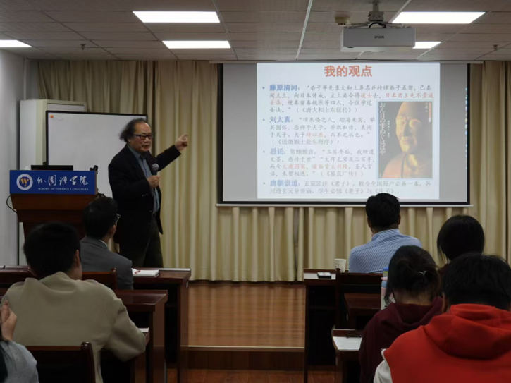 At 2:30 PM on November 8, an academic lecture focusing on the “Maritime Book Road” and the cultural transmission by Master Jianzhen was grandly held in the Lecture Hall of XueHai Building. The lecture was delivered by Professor Wang Yong, former professor at the Chinese Department of Peking University and Director of the Japanese Culture Research Institute at Hangzhou University, and was chaired by Professor Zhao Jinping, Head of the Japanese Department. The event was attended by faculty and students from the Japanese Department as well as cultural enthusiasts.