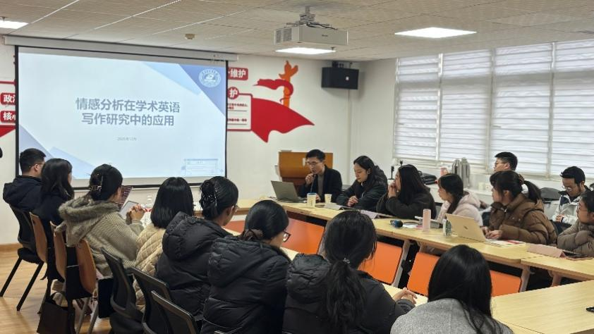 12月4日下午,外国语学院在学海楼统战之家举办了“情感分析在学术英语研究中的应用”学术讲座,特邀华中科技大外国语学院博士生导师朱浩然主讲。讲座由外国语学院肖先明教授主持。学院副院长黎慧、部分硕士生导师和外国语言文学及应用语言学、MTI翻译专业研究生积极参加了此次讲座。