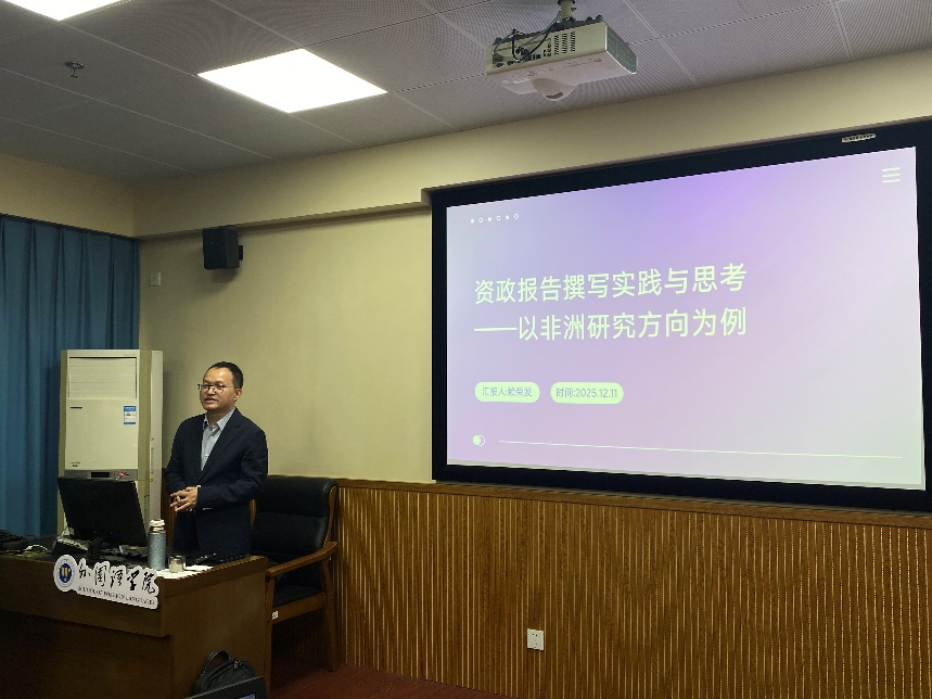 培训会上,赖荣发老师围绕“资政报告是什么”“为何要写”“如何写好”三大核心问题展开系统讲解。他提出,从学术研究到资政建言,需完成读者转向、目标转向、表达转向三重转变,即从面向学界同行转向服务决策者,从追求理论创新转向解决实际问题,从学术语言转向政策语言。赖老师强调,优质资政报告应具备时效性、针对性、可行性三把标尺。他结合非洲研究实际,将报告类型归纳为预警类、评估类、建议类、解决类四种,并指出选题应注重从“研究积累”向“政策需求”过渡。教师可通过主动关注国内外政策动态、重大事件与学术前沿三大信息来源“找题”,也可依托扎实的区域国别研究基础“接题”,真正实现“小切口,深分析”。在内容撰写层面,赖老师提醒需重视“题眼亮度”,使选题能迅速引起决策者关注。信息收集应夯实数据基石,优先采用调研访谈等一手资料,充分发挥驻非调研的“黄金价值”,同时以权威二手资料形成佐证。表达上须学会用决策者语言讲好非洲故事,做到逻辑清晰、建议具体、语言精炼。