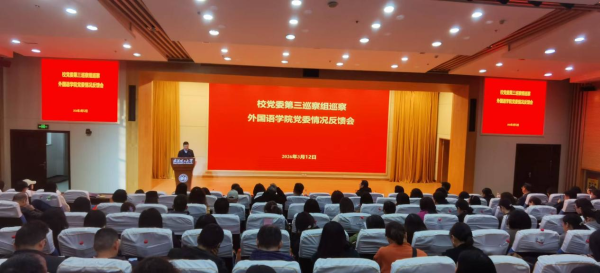根据学校党委统一安排,3月12日,校党委第三巡察组向外国语学院(以下简称外语学院)党委反馈巡察情况。校党委副书记李潮欣出席反馈会议,对抓好巡察整改工作提出要求。第三巡察组组长崔之余,副组长曾芝红、乔云莉,纪委信访与案件监督管理室主任兼监察处副处长彭成刚参加会议。会上,崔之余组长向外语学院领导班子、全体教职工、退休教职工代表和学生代表反馈巡察情况。外语学院党委书记李兴峰作表态发言,院长薛睿主持会议。