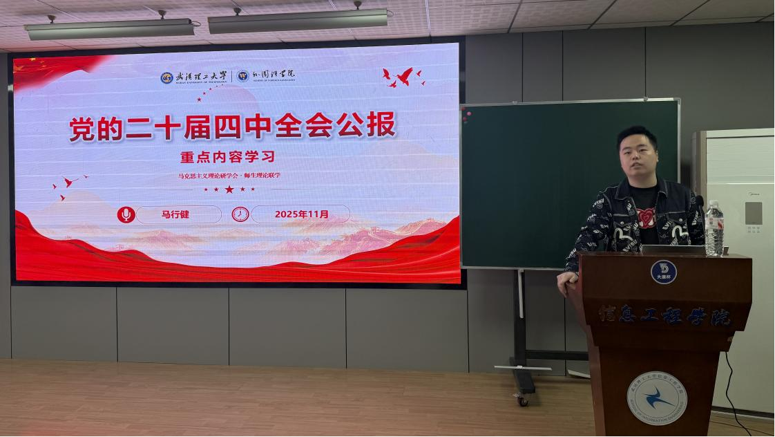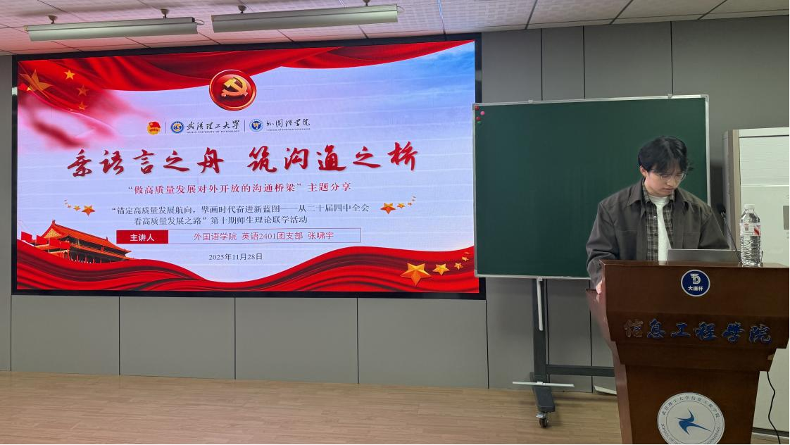 为深入学习贯彻党的二十届四中全会精神,深刻领会习近平总书记关于高质量发展的重要论述,引导师生将理论学习与专业实践相结合,凝聚服务中国式现代化建设的奋进力量,11月28日,由外国语学院、信息学院、艺设学院马克思主义理论研学会联合主办的第十期师生理论联学活动在鉴湖校区爱特楼1602报告厅成功举行。本次活动以“锚定高质量发展航向,擘画时代奋进新蓝图——从二十届四中全会看高质量发展之路”为主题,三院马克思主义理论研学会成员及指导老师共同参与了本次理论研学活动。