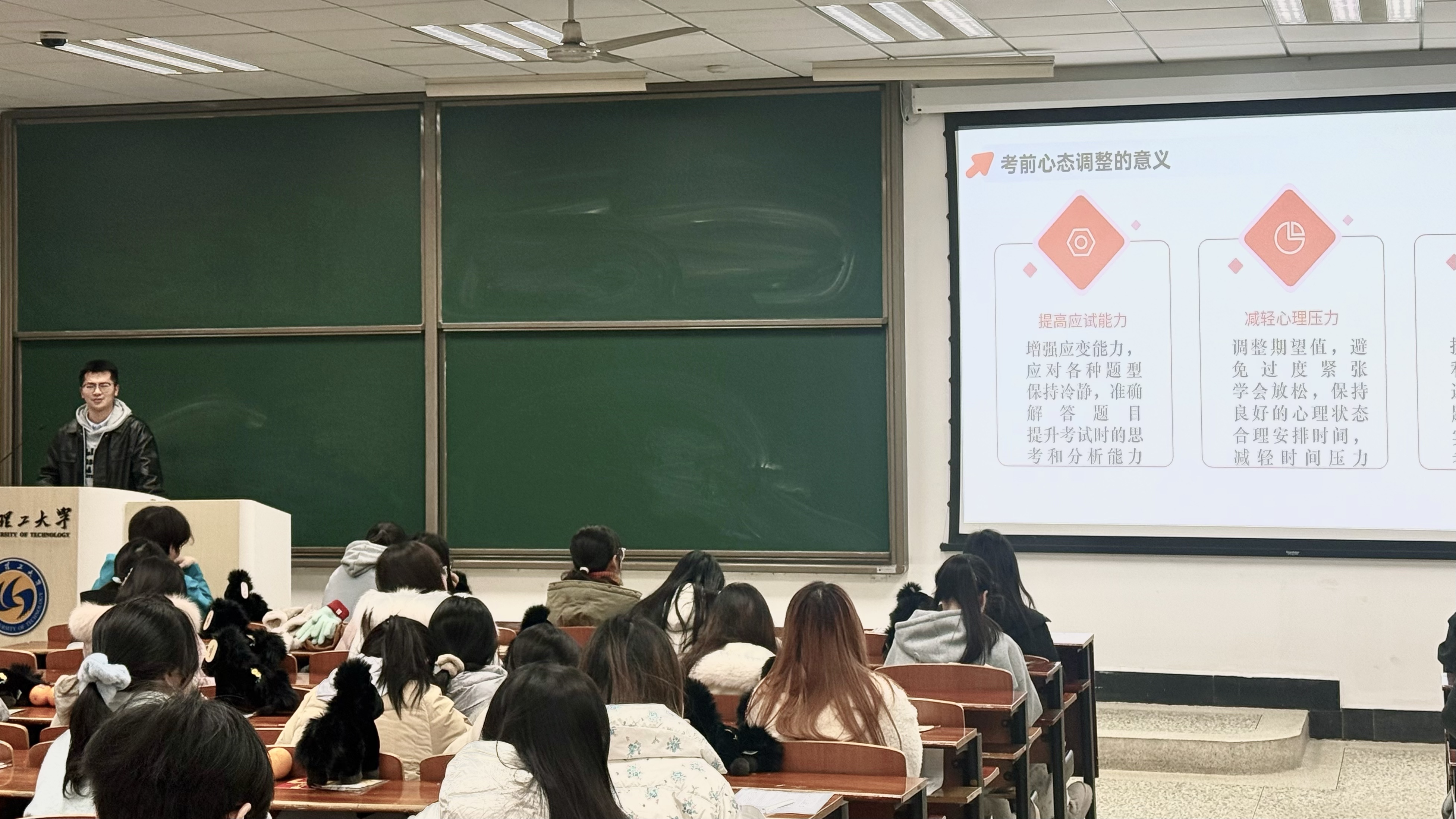 活动的第二项内容由毕业班辅导员老师开展《考研前心态调整的方法和策略》专题宣讲。宣讲中深入剖析了考前心态调整的重要性,系统介绍了考前心态调整的有效方法,并提供了应对考前焦虑的实用策略。这场及时的心理辅导旨在帮助同学们掌握科学减压技巧,学会在冲刺阶段保持从容自信,稳驭心绪,以平和、积极的心态迎接考试挑战。