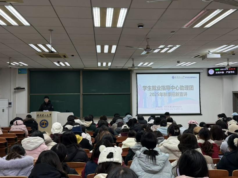 12月14日18点30分,由武汉理工大学学生就业指导中心主办的学生就业指导中心助理团招新宣讲会在博学主楼409成功举办顺利举行。本次宣讲会由自动化学院2023级学生赵康州担任主讲,外国语学院2024级本科生积极参与,现场气氛热烈。